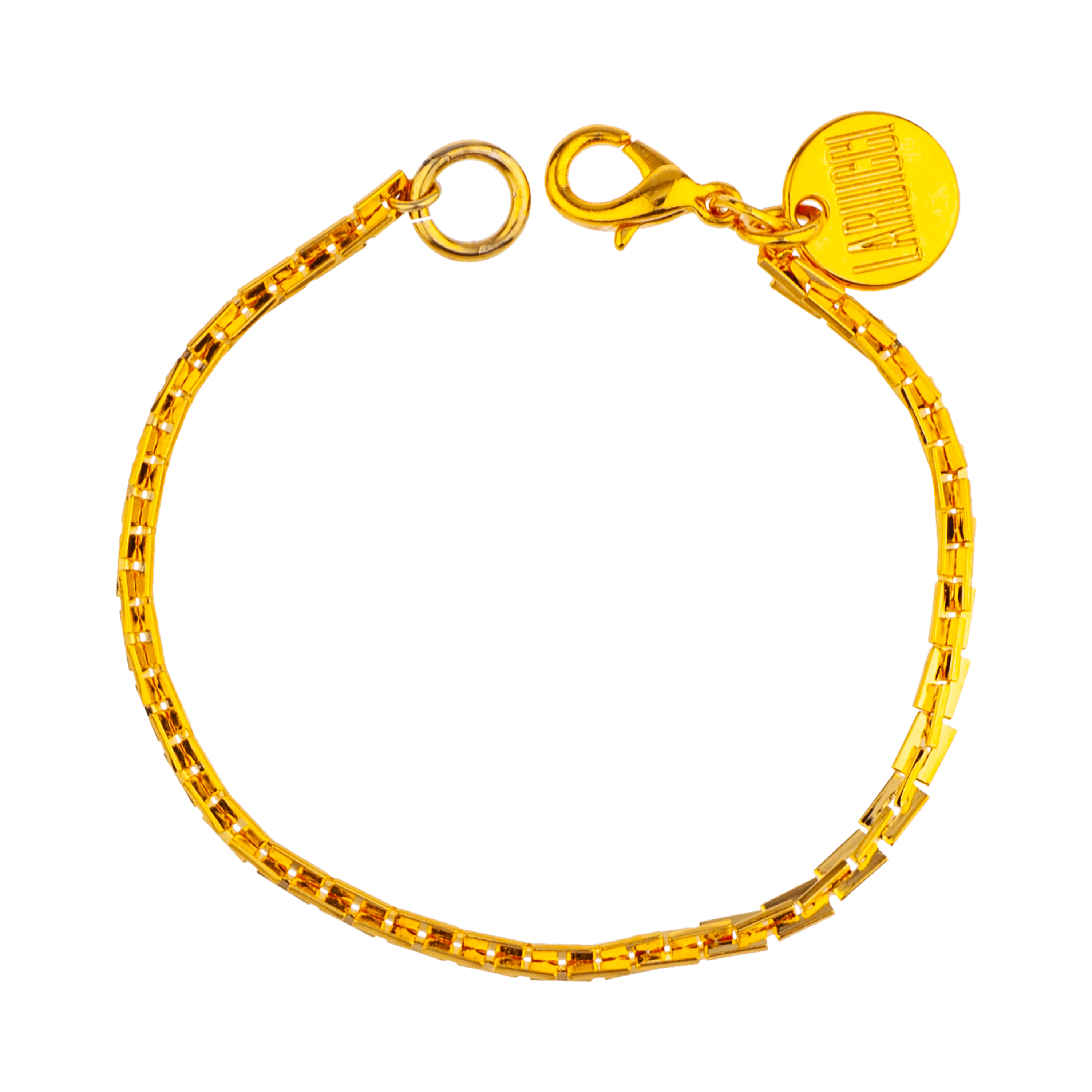 Pure gold energy on lock. This sleek, polished chain keeps it minimal but powerful—like stacking your style portfolio straight on your wrist.